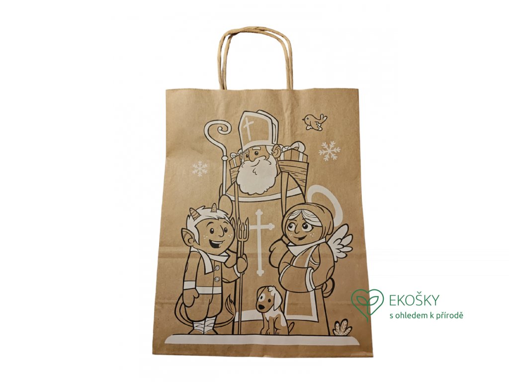 Papírová taška s potiskem mikuláše, čerta a anděla. Taška je s krouceným uchem a křížovým dnem.