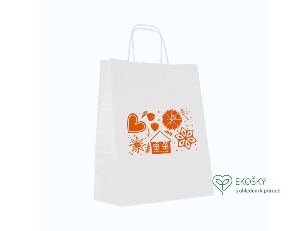 Papírová taška s vánočním potiskem. Taška je s plochým uchem a křížovým dnem.