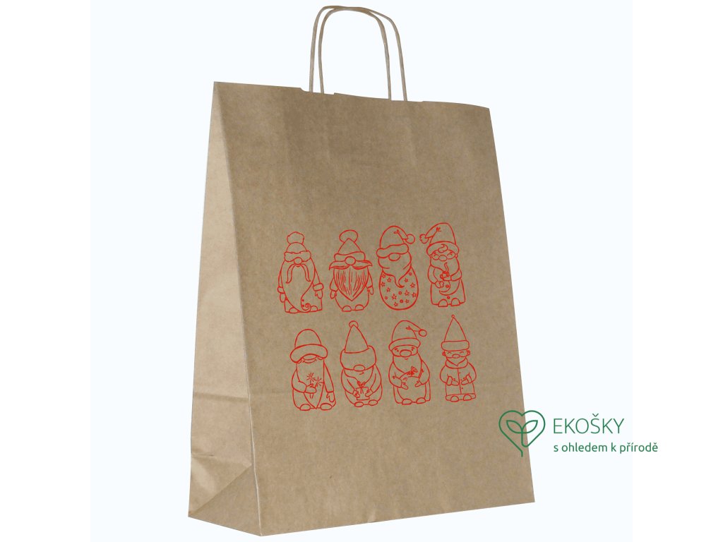 Papírová taška s vánočním potiskem. Taška je s plochým uchem a křížovým dnem.