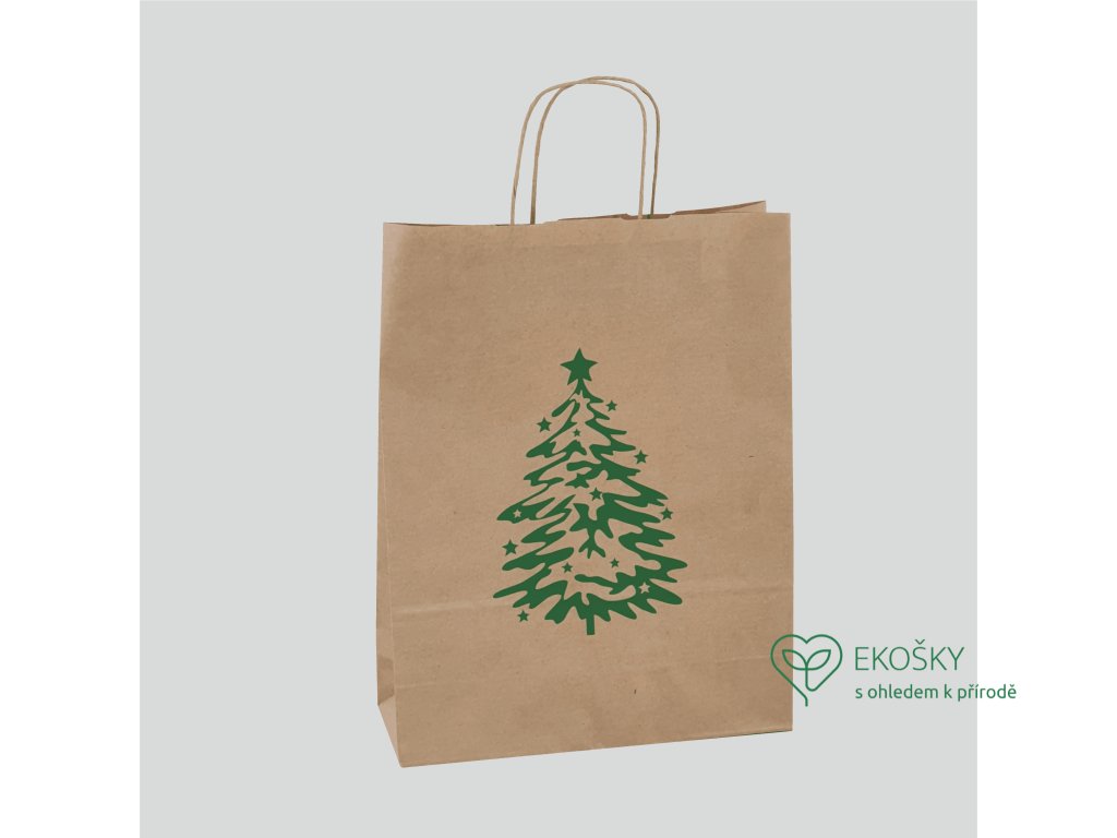 Papírová taška s vánočním potiskem. Taška je s plochým uchem a křížovým dnem.