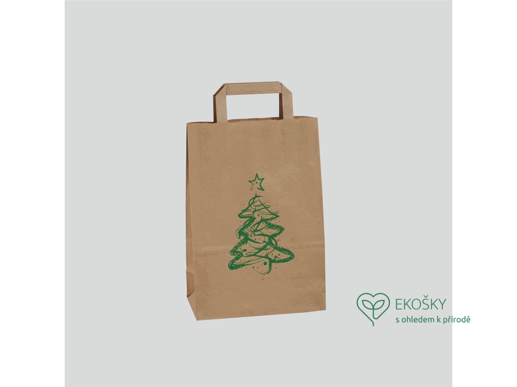 Papírová taška s vánočním potiskem. Taška je s plochým uchem a křížovým dnem.