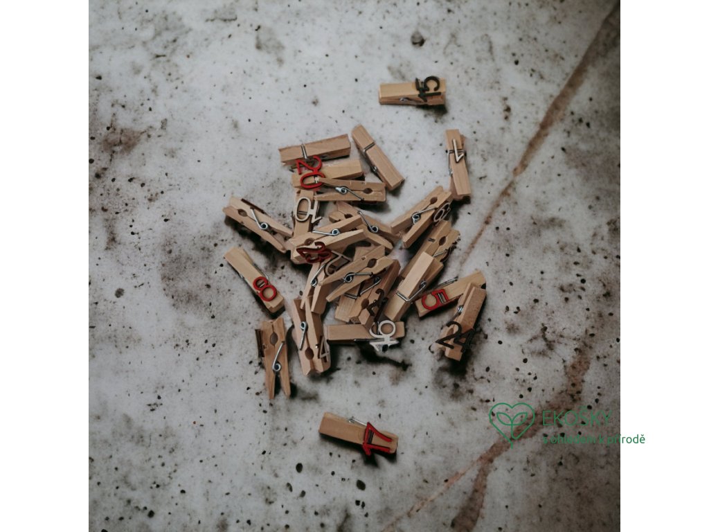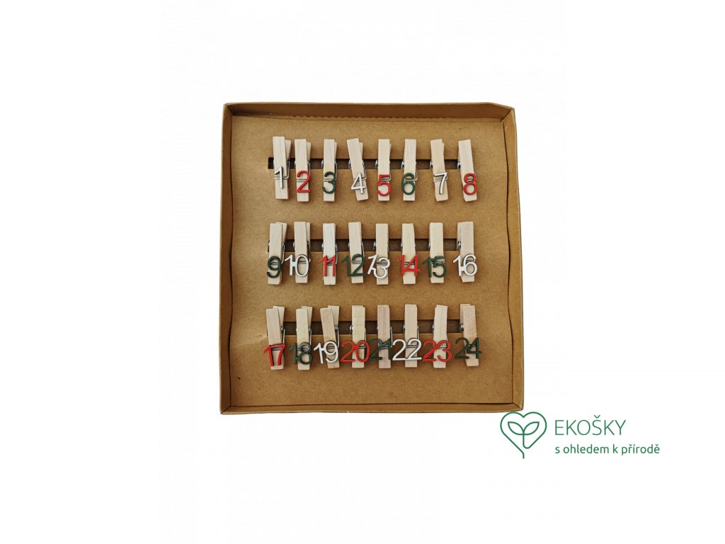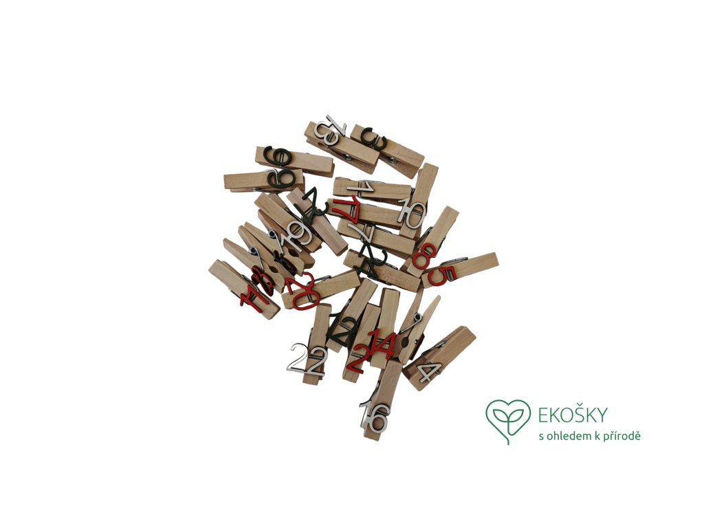 Naše sady obsahují celkem 24 dřevěných kolíčků s čísly od 1 do 24, které můžete připnout na papírové sáčky, krabice nebo jiné dekorační prvky.
