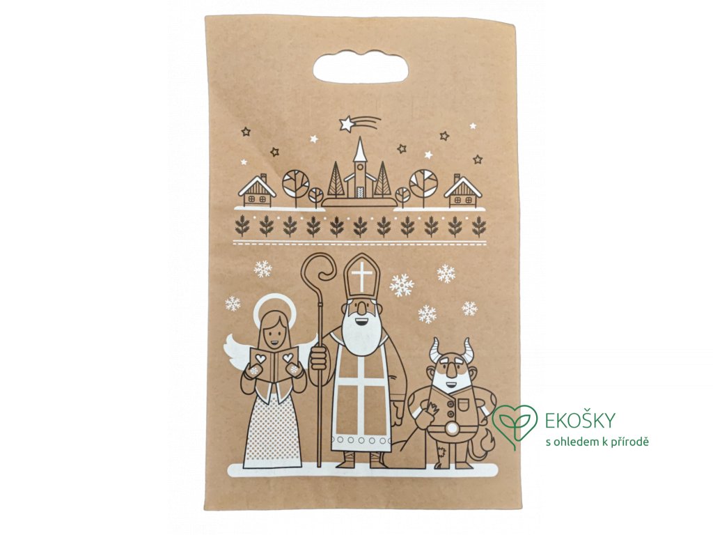Papírová taška s potiskem mikuláše, čerta a anděla. Sáček je s vyříznutým držátkem, tak akorát do ruky s plochým dnem.